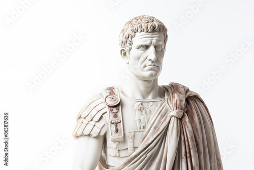 Roman bust sculpture on a white background. Topics related to ancient Rome. Roman civilization. Roman warlord. Archaeological discovery. Isolated image