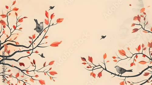 autumn, nature, leaf, tree, branch, bird, border, design, romantic, dreamy, whimsical, hand-drawn, soft, muted, fall, seasonal, foliage, organic, background, texture, pattern, print, ornamental, vintage, botanical, floral, autumn, cosy, elegant, serene, tranquil, aethereal, delicate, calming, nostalgic, earthy, rustic, natural, atmospheric, enchanting, charming, aesthetic
