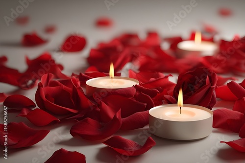 Romantic background with soft rose petals and glowing candles for spa, wellness, or Valentine’s Day theme. Spa background. Massage. Relax. Spa promotions. Romantic events. Self-care or luxury branding