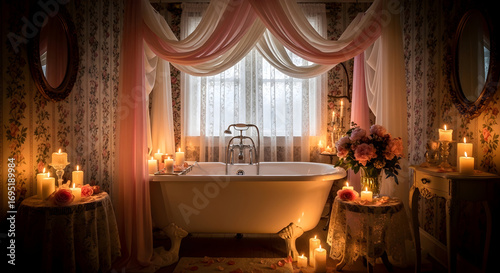 bathroom, spa, candle, romantic, tub, flower, luxury, relaxation, cosy, home, vintage, retro, elegant, interior, design, decor, warm, light, soft, floral, window, curtain, drape, serene, tranquil, peaceful, ambience, bathe, freestanding, aesthetic, ornate, antique, classic, comfortable, beautiful, inviting, style, lifestyle, self, care, well-being, treatment, get-away, retreat