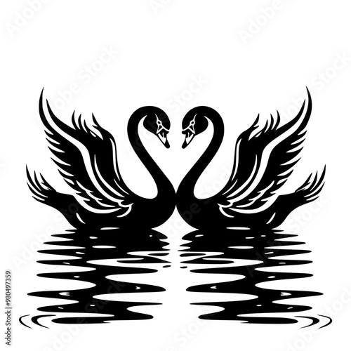 Romantic Black Swans Facing Each Other in Silhouette, Elegant silhouette of two black swans facing each other, wings spread, reflecting love and unity on calm waters.