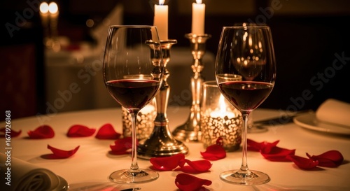 Romantic Candlelit Dinner Table with Red Wine Glasses and Rose Petals
