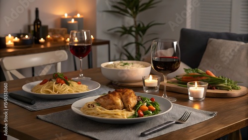 Romantic Candlelit Dinner with Pasta, Chicken and Red Wine on Wooden Table