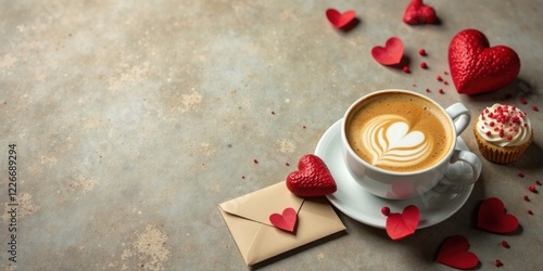 cappuccino, hot drink, latte art, nubes, heart, love, romantic, valentine, february 14, february, dessert, cupcake, sweet, treat, sweet, confectionery, bakery, sugar, sprinkle, red, envelope, letter, message, note