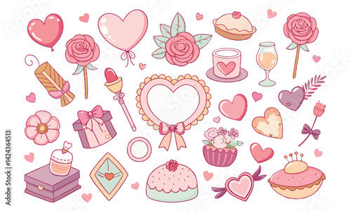Romantic Coquette Clipart Set – Hand-Drawn Birth Day, Valentine’s Day & Wedding Elements with Hearts, Ribbons, Roses, and Vintage Love Decor