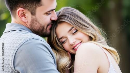 romantic, couple, embracing, forest, love, nature, happy, affection, blond, green, joyful, intimate, kiss, lush, passionate, peaceful, serene, tender, together, wedding, invitation, card, art, wall, bliss, hug, smile, beauty, heartwarming
