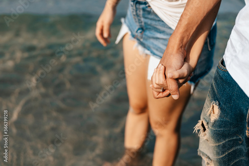 Romantic couple holding hands and walking on beach. Man and woman in love.