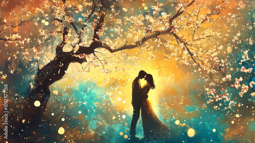 romance, couple, love, tree, painting, kiss, vibrant, floral, spring, artistic, nature, blossom, pastel, sunset, fantasy, dreamy, warm, branch, flower petals, tenderness, hugs, colourful, affection, beauty, connection, harmony, light, gentle, delicate, passion, glowing, serene, blooming, aethereal, fairy tale, happiness, elegant, magical, joy, intimacy, surreal, timeless, outdoors, enchantment, oneness, emotion