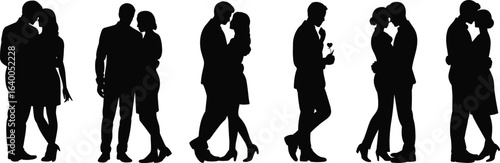 Romantic couple silhouette collection, kissing, hugging, dating, love scenes vector, Valentine’s Day, emotional connection, relationship, passion, affection illustration