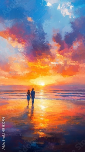 sunset, beach, ocean, couple, romance, love, human relationships, silhouette, holding hands, walking, sea, sky, cloud, vibrant, colourful, golden hour, romantic, idylli, peaceful, serene, tranquil, calm, beautiful, picturesque, artwork, painting, digital artwork, illustration, art, graphic, design, background, wallpaper, travel, vacation, holiday, summer, evening, twilight, togetherness, intimacy, affection, happy, joyful, dreamy