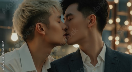 gay, romance, evening, couple, asian, male, love, connection, tender, kiss, intimate, light, young, elegant, attire, atmosphere, oneness, affection, romantic, hugs, warmth, human relationships, bonding, togetherness, sentiment, emotion, gentle, caring, serene, peaceful, tranquil, harmonious, blissful, contentment, engagement, companionship, partner, devotion, commitment, celebration, happiness, joy, spark, indoor, night, twinkle, dreamy, affectionate, stylish, modern
