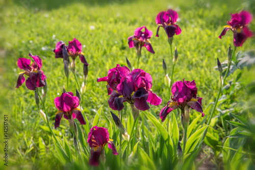 Romantic flowerbed in purple tones.Beautiful colorful flowers - iris. Spring flowering. Easter, Mother's, Valentines, Women's, Earh Day.