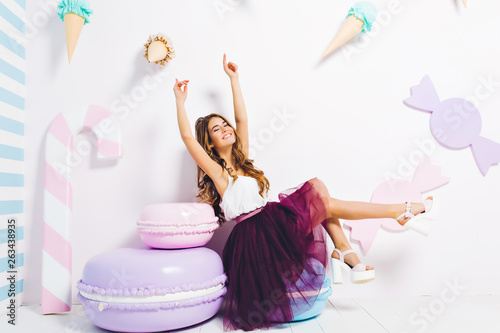 Romantic girl in trendy white heeled shoes having fun on her birthday party, sitting on toy cookie waiting for friends. Stunning young woman in violet lush skirt relaxing in her room cute decorated.