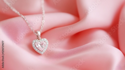 Romantic heart diamond necklace resting on a soft blush pink linen fabric