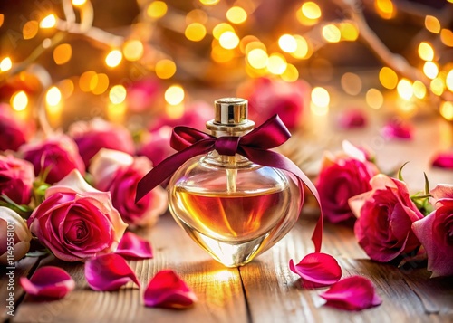 Romantic Heart Perfume Bottle with Roses and Lights - Stock Photo