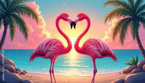 Romantic illustration of flamingos on sunset beach. Flamingos form heart shape, symbol of love. Palm trees, sea, tropical paradise. Perfect for greeting cards, travel advertising, vacation design.