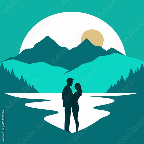 Romantic Lovers Silhouette by Turquoise Mountain Lake Vector Art for T-Shirt Design