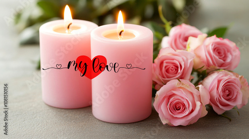 Romantic Pink Candles with Flame and Roses Arrangement for Love Decoration, Perfect for Celebrations, Anniversaries, and Special Moments in Elegance and Warmth