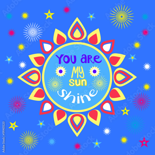 Romantic quote you are my sunshine. Fancy cartoon ornate hand lettering. Vector vintage love phrase concept. Inspirational handwriting saying for Valentine day weeding decorative banner background