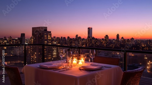 rooftop, dinner, romantic, sunset, city, skyline, table, setting, candle, city landscape, evening, night, urban, light, view, date, dining, illuminated, celebration, elegant, eatery, luxury, meal, fine dining, ambience, atmosphere, twilight, dusk, city lights, window, building, architecture, furniture, glassware, cutlery, plate, napkin, serene, tranquil, modern, lifestyle, travel, vacation, special occasion, balcony, terrace