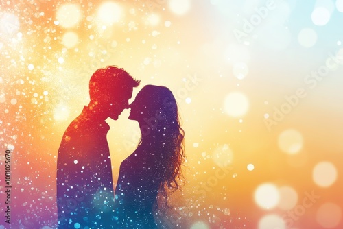 Romantic silhouette of a couple sharing a tender moment against a colorful bokeh background