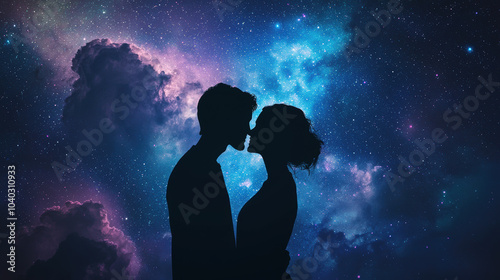 Romantic silhouette of a couple under a star-filled sky, with cosmic clouds blending into their profiles