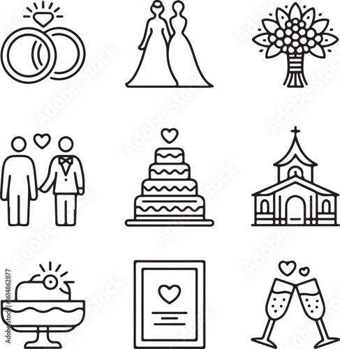 Romantic Wedding Line Art Icons Set Rings, Bride and Groom, Bouquet, Cake, and Ceremony Symbols