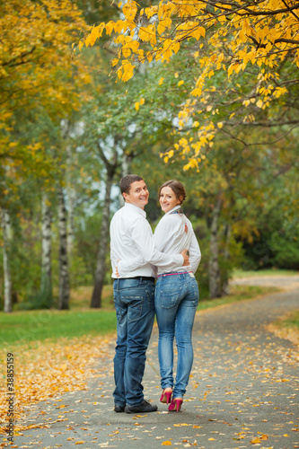Romantic young beautiful couple on autumn walk