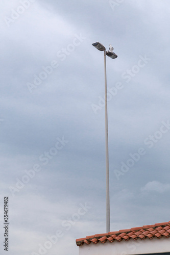 roof, seagull, lamp-post, tile, lighting, bird, sea, sky, clear, vertical, blue, spain