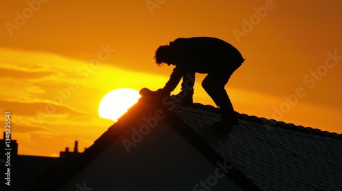 Rooftop repair action at sunset urban setting photography silhouette viewpoint home maintenance concept