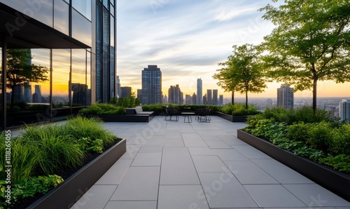 rooftop, terrace, city, skyline, sunset, greenery, plant, landscape, architecture, seating, relaxation, view, urban, nature, design, environment, evening, light, cloud, modern, space, patio, furniture, calmness, beauty, leisure, lifestyle, scenic, horizon, tree, paving, glasses, reflections, peaceful, sky, atmosphere, community, gathering, contemporary, aesthetic, structure, harmony, balance, escape, retreat, comfort, ambience, scenery