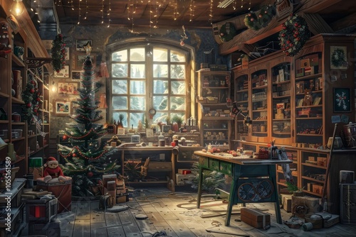 Room filled with shelves of Christmas gifts, Cozy christmas scene with decorations, a warming fireplace and a christmas tree, Happy christmas, full of seasons greetings