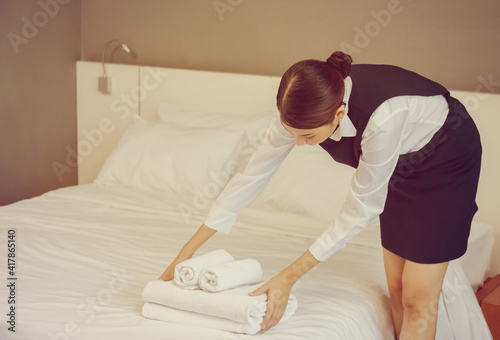 Room service putting stack of fresh white bath towels on the bed sheet. Female housekeeper putting clean towels on bed. Room service maid cleaning hotel room.