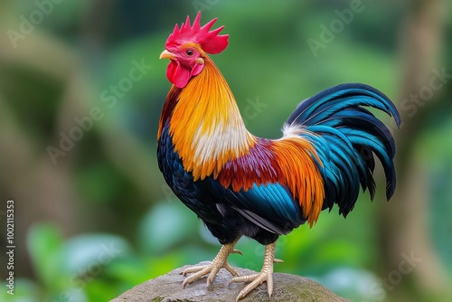 Rooster with a black and red head. It is standing on a green field. The rooster has a black and red tail. full body shot of a rooster