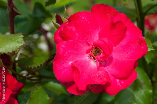 Rose flower blooming in the spring garden, closeup view. Summer flower of red rose blooming in the garden