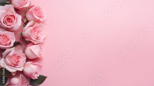 rose flower on pink background. banner, space for text, for product display. Flat lay, top view, copy space. Mother's Day celebration, Valentine's Day