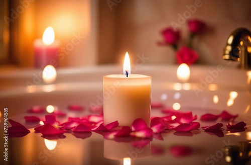 Rose petals and candles in the bathtub. Valentines day concept. Scented burning candlelight. Beauty water therapy spa wellness. Romantic bath health care relaxation. Luxury bathroom idea for couple.