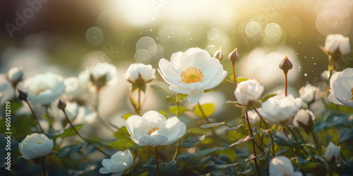 Rosehip flowers. White rosehip flowers in the garden. Beautiful Floral background for greeting card for Birthday, Wedding, women's day, Mother's day. Generative ai illustration