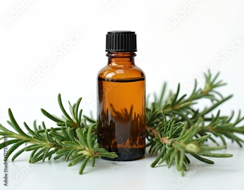 Rosemary essential oil bottle on white background. Sprigs surround amber glass container. Natural herb extract for aromatherapy, alternative medicine and skincare.