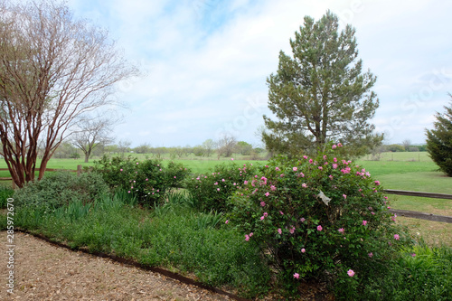 fence, flora, fog, garden, gardening, green, path, pink, rail, red, rose, spring, texas, tree