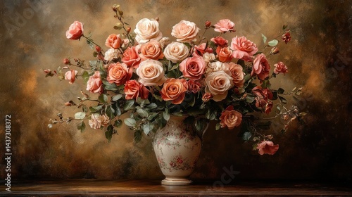 flower, rose, bouquet, vase, still life, floral, arrangement, vintage, antique, art, decorative, beauty, elegant, romantic, love, gift, wedding, pink, orange, peach, red, cream, nature, garden, decor, home, interior, style, design, pretty, beautiful, painting, photo, realistic, detail, closeup, classic, luxury, ornate, ceramic, porcelain, textured, brown, gold, rustic, decoration, high, quality, display