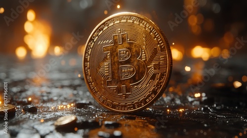 Rotating golden bitcoin hovering over a dark surface, enhanced by smoke and light effects, symbolizing digital wealth.