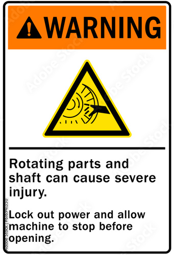 Rotating shaft hazard sign and labels rotating parts and shaft can cause severe injury. Lockout power and allow machine to stop before opening