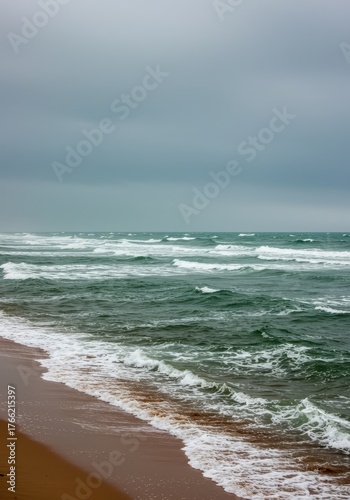 Rough, choppy coastal waves crash onto the expansive sandy shoreline under an overcast, hazy sky, typical of northern European waters ,wild ,cold water ,eastern