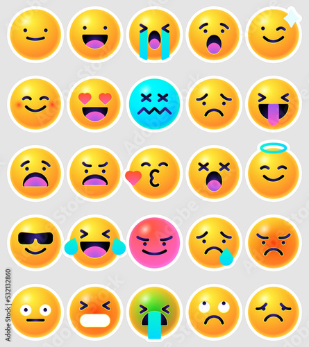Round 3d emoticons set. Yellow Emoji faces emoticon smile, digital smiley expression emotion feelings, chat cartoon emotes. Vector illustration icons
