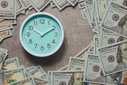 time, alarm, dollar, money, clock, watch, cash, business, concept, finance, investment, deadline, bill, timer, financial, banking, hours, economy, pay, bank, profit, currency, income, payment, tax, success, debt, reminder, savings, future, loan, return, wealth, rich, background, credit, deposit, market, bill, banknote, symbol, closeup, photo, turquoise, blue, grey, up high, topview, lay