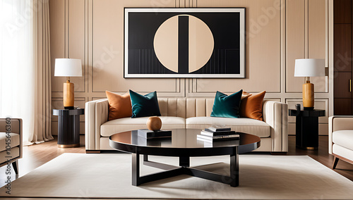 round coffee table sits front beige sofa paneling wall art deco style poster modern furniture