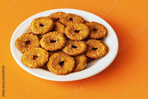 food, cracker, salt, hole, shape, snack, plate, flour, wheat, grain, chips, thin, crispy, salted, round, crisp, tasty, salty, pretzel, crunchy, small, baked, topview, yellow, orange background, ingredient, circle, nourishment, healthy, top, colours, fresh