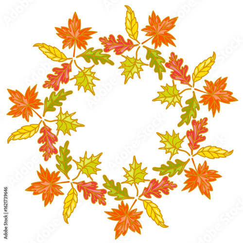 Round frame, wreath with bright oak, maple leaves. Hand drawn frame in outline doodle style.