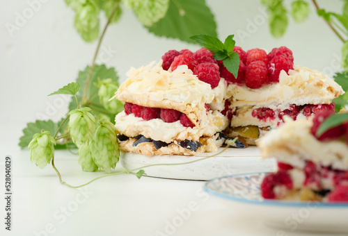cream, egg, fruit, white, meringue, mint, pastry, raspberry, red, sugar, deliciously, baked, berry, cake, cookery, delicious, dessert, epicure, food, fresh, homemade, summer, sweet, table, tasty, whipped, black, plate, leaf, round, pie, piece